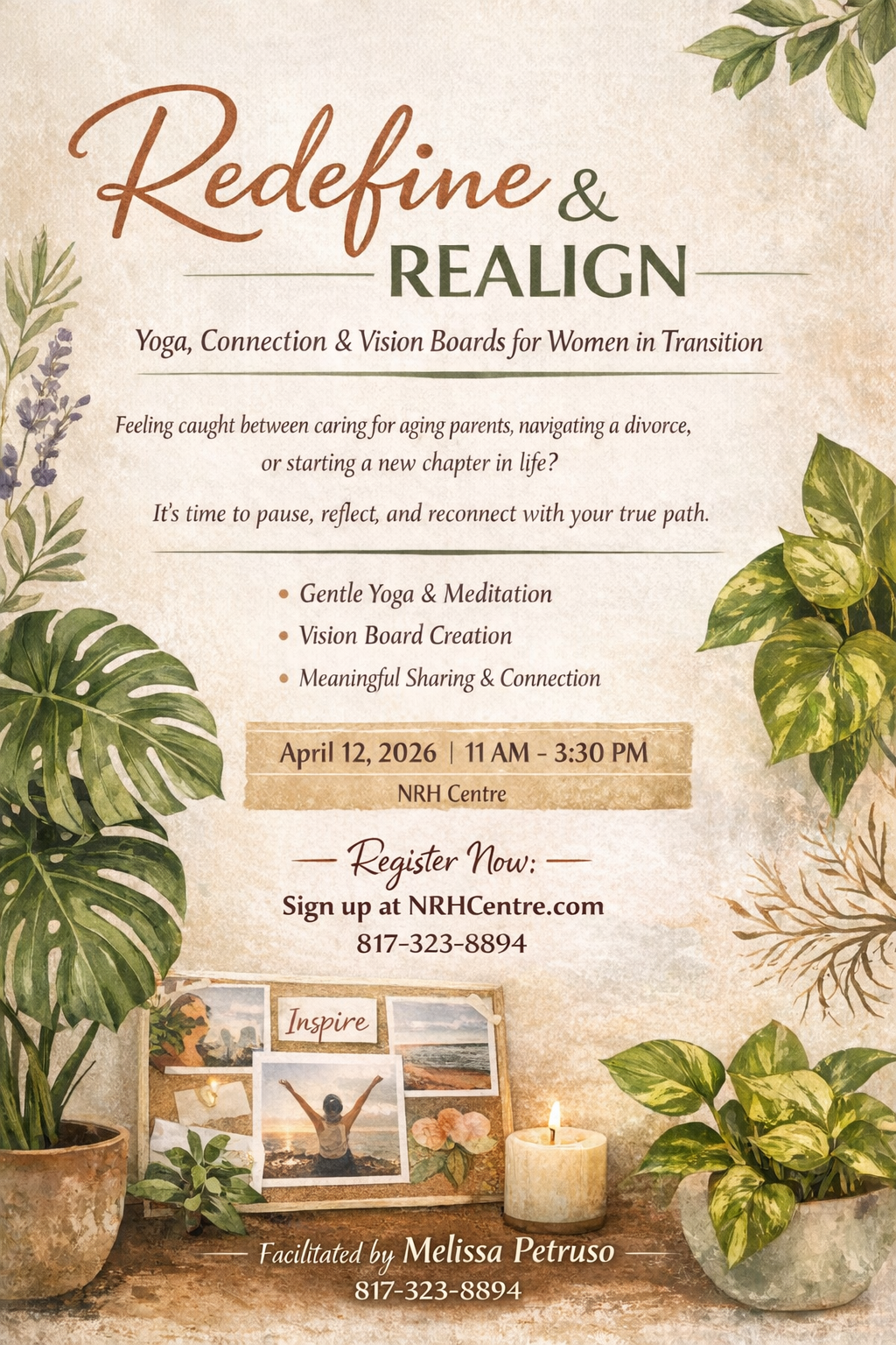 Life’s transitions can feel overwhelming, isolating, and uncertain, but you don’t have to navigate them alone. This Yoga, Coaching & Vision Board Workshop is designed specifically for women moving through seasons of change: empty nest, the sandwiched generation, divorce, career shifts, caregiving, loss of a spouse, or simply feeling unsure of “what’s next.” In this safe, supportive space, we’ll breathe, move, reflect, and reconnect with who you are and who you’re becoming.